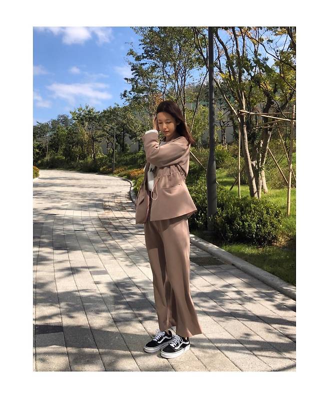나혜미가 베이지 컬러의 세트업으로 편안하면서도 스타일리시한 룩을 연출하고 있다. 허리 끈으로 실루엣을 살린 재킷과 와이드 팬츠의 조합이 세련된 분위기를 자아낸다. 화이트 티셔츠와 블랙 반스 스니커즈로 캐주얼함을 더했으며, 공원 산책로에서 자연스러운 포즈를 취하며 일상 속 패션 감각을 뽐내고 있다. 자연과 어우러진 베이지 톤의 의상은 가을 시즌에 어울리는 세련된 데일리 룩의 정석을 보여주고 있다.