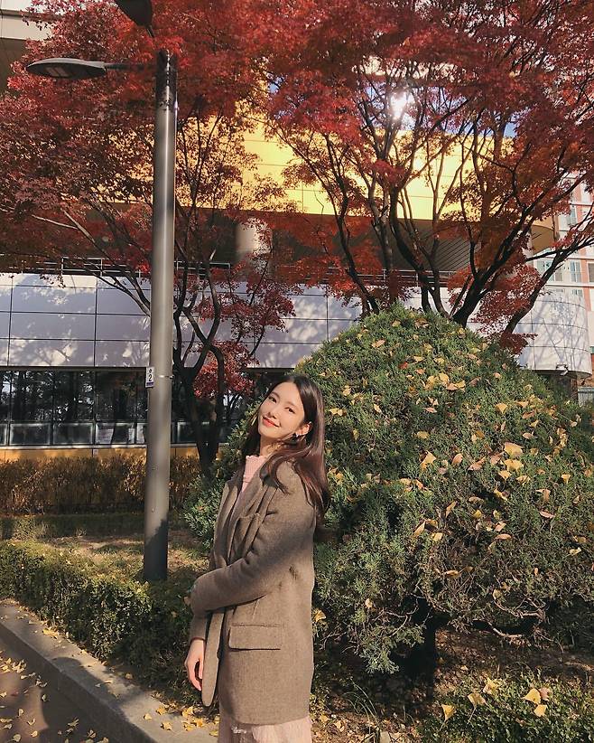 붉게 물든 단풍을 배경으로 나혜미가 브라운 계열의 코트를 우아하게 소화하고 있다. 핑크 니트와 레이어드한 클래식한 코트 스타일링이 가을 분위기와 완벽하게 어우러지고 있다. 자연스럽게 흐르는 긴 생머리와 미소가 여성스러운 매력을 더하며, 도시적인 건물과 붉은 단풍이 만들어내는 대비 속에서 세련된 가을 패션을 완성하고 있다. 특히 코트의 클래식한 실루엣이 배우의 우아한 이미지를 한층 돋보이게 한다