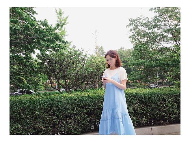 배우 나혜미가 푸른 하늘을 닮은 파스텔 블루 원피스를 선보이고 있다. 티어드 디자인의 여성스러운 원피스에 흰색 티셔츠를 레이어드하여 캐주얼함을 더했다. 푸른 녹음이 우거진 공원에서 휴대폰을 확인하는 모습이 여유로운 일상을 연출하고 있다. 특히 자연스럽게 흘러내리는 붉은 빛 웨이브 헤어스타일이 화사한 분위기를 완성하며, 도심 속 자연과 조화를 이루는 세련된 데일리 룩을 선보이고 있다.
