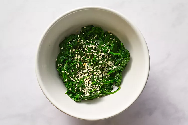 4. 시금치는 살짝 데친 후 물기를 꼭 짜고 숙주처럼 양념합니다.