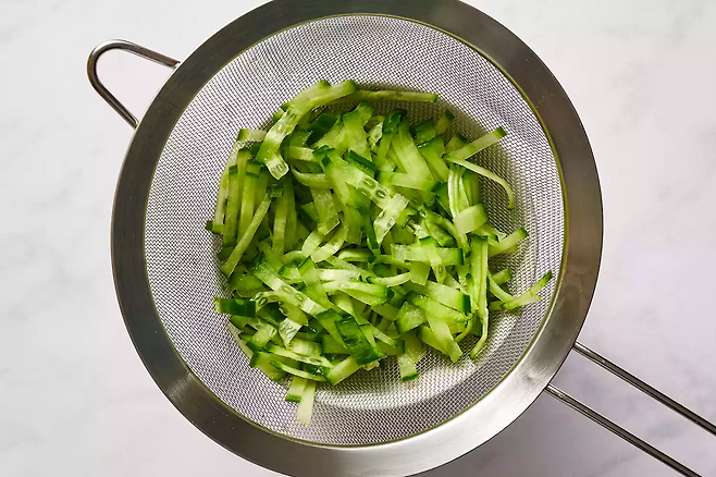 2. 오이는 채 썬 후 소금을 살짝 뿌려 20분간 절이고, 헹군 뒤 물기를 짭니다.