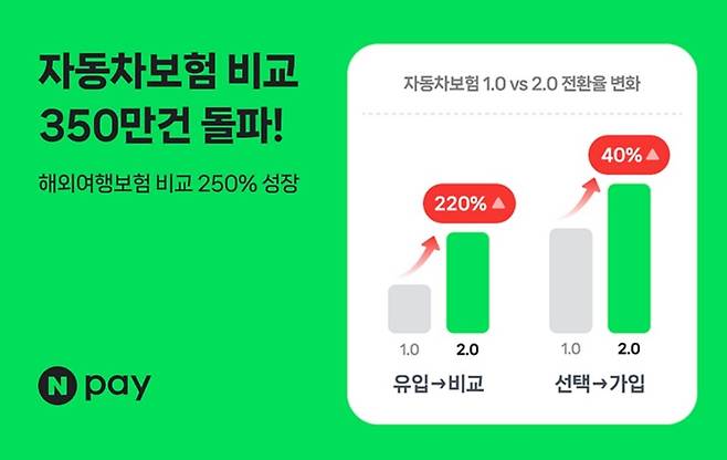 [엠투데이 이정근기자] 네이버페이(Npay)가 지난해 1월부터 시작한 자동차보험비교 누적 이용건수가 350만건을 돌파했다고 밝혔다.