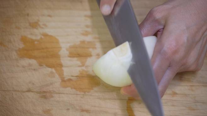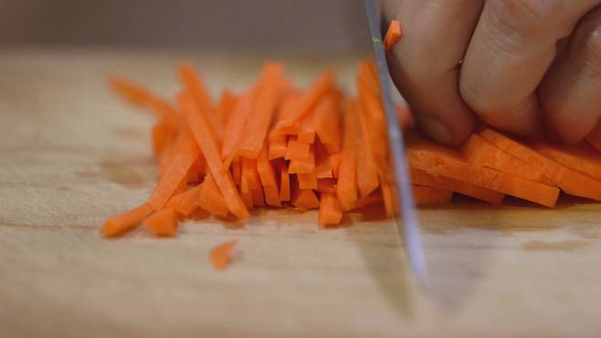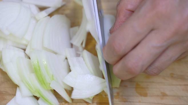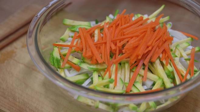 양파는 심지를 제거하고 반으로 잘라 얇게 썰어 주고, 애호박과 당근은 채 썰어 주세요.