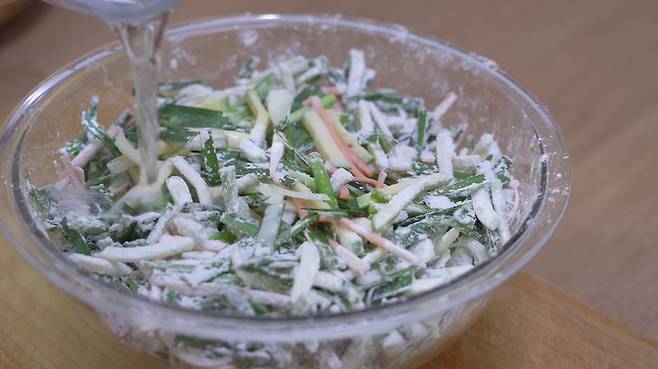 부침가루, 튀김가루를 묻힌 야채에 소금물 반을 붓고 섞어 주세요.