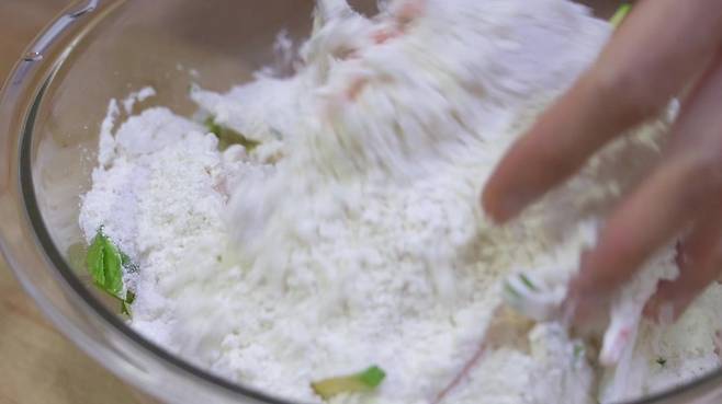 튀김가루 부침가루를 넣고 같이 섞어 주세요.