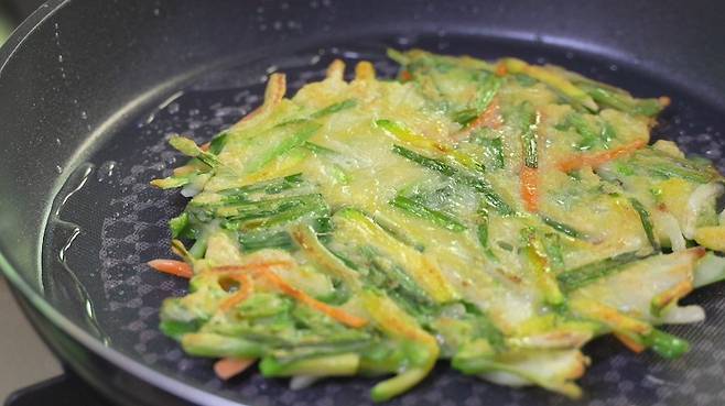 지글지글 아주 맛있게 완성된 부추전이에요. 여러 가지 야채가 들어가 아이들 간식으로 정말 좋고, 술안주로 제격이에요.