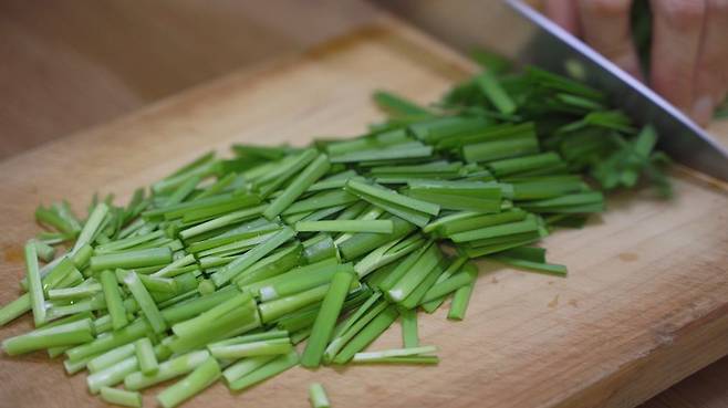 부추는 손가락 한마디에서 한마디 반 정도 크기로 썰어 주세요.