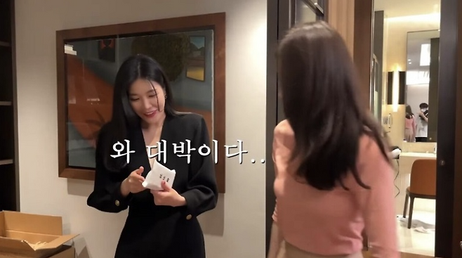 이해리는 강민경에게 축의금을 받았고, 이해리는 "두께 봐. 와 대박이다"라며 놀라워했습니다.