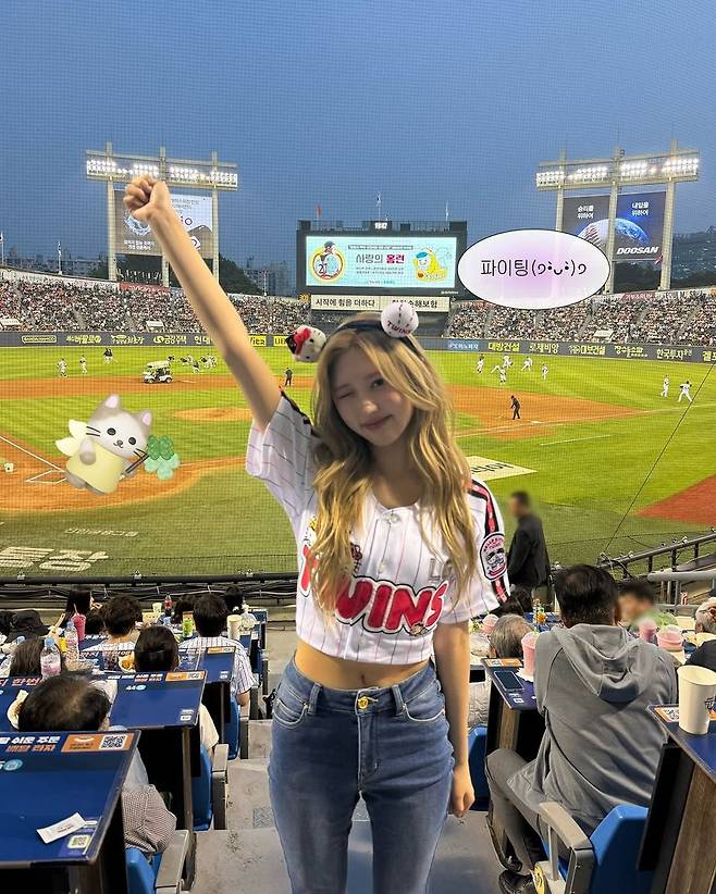 사진 속 가을은 응원봉 대신 주먹을 불끈 쥐고 ‘파이팅’을 외치며 활짝 웃고 있다. 한쪽 눈을 윙크하며 응원하는 모습은 그녀 특유의 상큼함을 배가시켰고, 뒷배경으로 보이는 가득 찬 관중석은 그녀의 인기와 존재감을 반증했다.