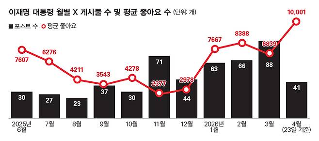 이 대통령은 X를 어떻게 활용하고 있을까. 취임 후 약 4개월 동안은 매달 20~40건의 글을 올렸다. 그러나 올해 들어선 매달 60~80건으로 급격히 늘어났다. 지난 3월 동안에는 88건이 올라오기도 했다. 게시물 내용도 점차 질적으로 변화하고 있다는 분석이 나온다. 초반에는 일정 및 성과 발표 위주로 글을 올렸지만, 이제는 이 대통령의 개인 사정이나 입장을 드러내는 창구가 되고 있다. 가령 지난 20대 대선에서 패배한 데 대해 '조폭설과 대장동 사건만 아니었어도 결과가 달랐을 것'이라고 주장하는가 하면, 국민의힘에 해당 의혹과 관련한 사과를 요구하기도 했다.