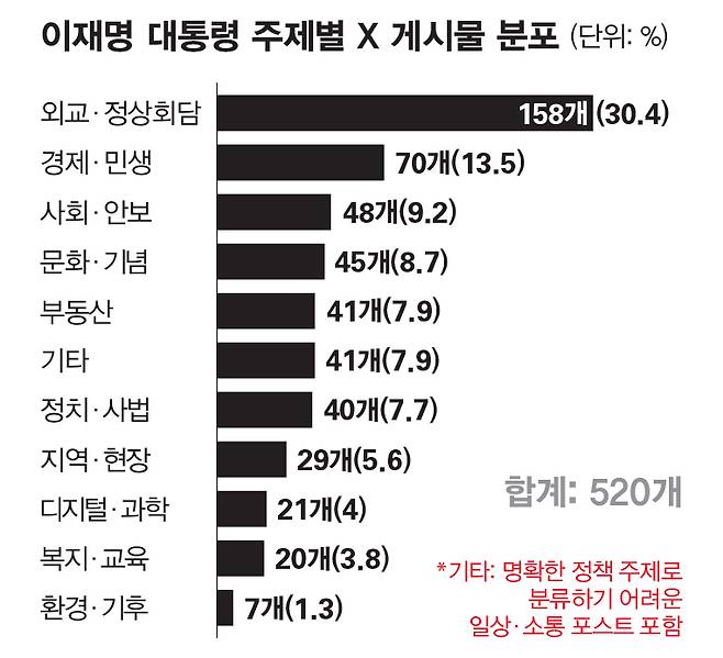 숫자로 보면, 외교·정상회담 관련 게시물(158개)이 경제·민생(70개), 사회·안보(48개)를 합친 수치보다 더 많았다. 문화·기념(45개)과 부동산(41개), 정치·사법(40개) 관련 글이 그 뒤를 이었다. 외교 게시물에 달리는 평균 좋아요 수도 6669개로 전체 평균(5966개)보다 많았다. 취임 후 올린 게시물 중 '좋아요 1위' 역시 올해 1월13일 게재된 다카이치 일본 총리와 드럼 합주를 하는 사진이었다. 여기엔 무려 12만8550개 좋아요가 달렸다. 이 대통령은 해당 게시물에 "박자는 조금 달라도 리듬 맞추려는 마음은 같았던 것처럼, 미래지향적 한일 관계도 한마음으로 만들어가겠습니다"라고 적었다.
