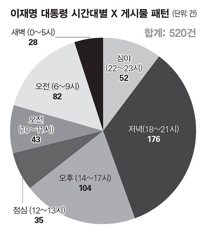 무려 28건의 게시물이 새벽 0~5시 사이에 올라온 점도 비슷한 효과다. 이 대통령은 주로 저녁 시간대에 글을 올리지만, 부동산 정책이나 이스라엘 비판 관련 후속 글의 경우 새벽 시간대에 포스팅했다. 이 대통령 스스로 관심이 많은 이슈에 대해선 참모진 검토 없이 즉흥적으로 소통하는 방식을 선호한다는 것이다. 요일별 게시물 수를 분석해 보면 국무회의 및 현안 발표 등 공식 일정이 몰려 있는 평일 중에서도 수요일(108개)에 가장 많이 올라왔다. 가장 적은 날은 토요일(41개)이었다.