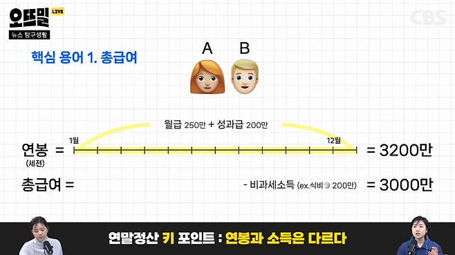 먼저 총급여를 볼게요. 이게 우리가 생각하는 그 연봉에 가장 가까운 개념이에요. 설명을 위해 A와 B 두 사람을 가정해볼게요. 이들이 직장 동기인데 월급을 동일하게 세전 250만 원 정도 받고, 둘 다 일도 비슷하게 잘해서 성과급도 동일하게 200만 원 받았어요. 그럼 연봉은 세전으로 3200만원이 됩니다. 총급여는 여기서 비과세 소득이라는 걸 뺀 건데요. 세금을 걷지 않는 항목이 월급에 포함돼있어요. 대표적인 게 식비나 교통비 같은 항목이죠. 그래서 총급여라는 건 결국 연봉에서 비과세 소득을 뺀 나머지가 됩니다. A와 B 같은 경우, 식비가 연 200만원 나왔다고 하면 세전 연봉 3200만 원에서 비과세소득 200만 원을 뺀 나머지, 3000 만 원이 총급여가 되는 거죠.