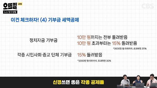 ◆ 신혜림> 마지막으로 하나 덧붙이자면, 기부금이 세액 공제가 된다는 거예요. 일단 정치자금 기부금이 있어요. 내가 정치인이나 정당에 10만 원까지 후원을 했다고 하면 연말정산 때 그 10만 원을 모두 돌려받습니다. 또 고향 사랑 기부금이라고 지역에 기부할 수 있는 금액이 있어요. 이것도 10만 원까지 전부 다 돌려받을 수 있고 응원행사가 있어서 3만 포인트가 주어져요. 그걸로 뭔가 더 살 수 있는 건데, 이거 꼭 하셔야겠죠. 또 안 입는 옷이나 물품을 아름다운 가게, 굿 윌 스토어, 이런 곳에 기부하면 기부금 영수증을 받아서 세액 공제에 포함시킬 수 있습니다.