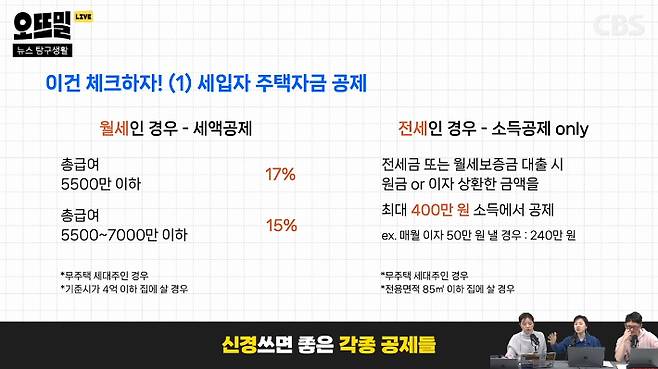 ◆ 신혜림> 또 중요하게 챙겨야하는 부분이 주택 자금이에요. 특히 월세는 세액공제가 되거든요. 총급여 5,500만 원 이하일 때는 내가 낸 전체 월세의 17%를 돌려받을 수 있습니다. 물론 무주택자이자 세대주여야 하지만요. 그리고 저는 지금 전세에 살고 있거든요. 전세는 세액공제는 안되는데 소득공제가 돼요. 대출 받은 원금이나 이자를 상환한 금액을 연간 최대 400만 원까지 내 소득에서 공제해서 과세표준을 매깁니다. 예를 들어서 제가 월 50만 원씩 이자를 내고 있다고 치면 12달 동안 600만 원이잖아요. 그럼 600만 원의 40%인 240만 원이 과세표준에서 깎이는 거죠. 그리고 주택청약 같은 주택 마련 저축도 최대 120만원까지 공제가 가능하니까 챙겨보시면 좋습니다.