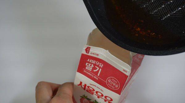 프라이팬에 남은 기름을 처리할 때 가장 난감합니다. 이때 우유통에 기름을 식혀서 담아 버리면 깔끔하게 정리됩니다.