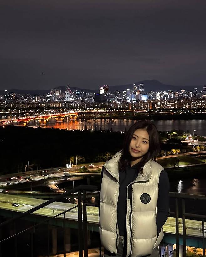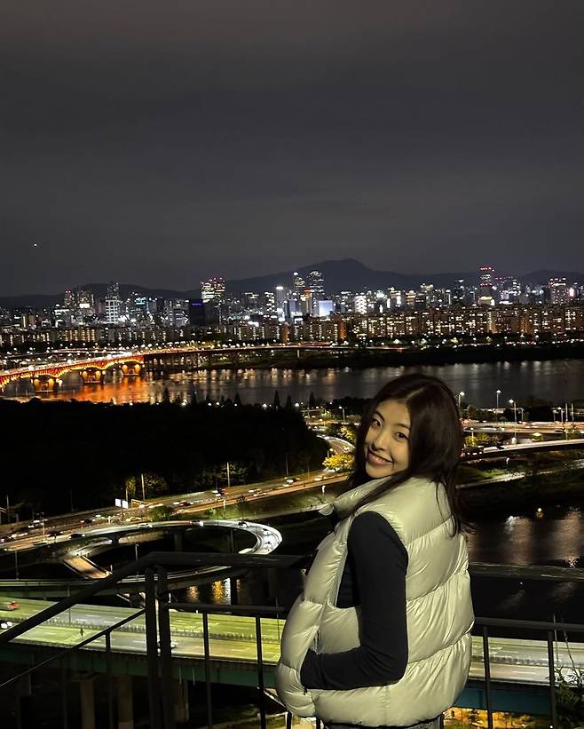 이나현은 최근 자신의 SNS에 한강과 서울의 도심 야경을 배경으로 찍은 사진을 업로드했다. 짙은 네이비 이너웨어 위에 오버핏 화이트 패딩 조끼를 매치한 룩은 포근하면서도 도회적인 느낌을 자아낸다. 무심한 듯 자연스럽게 내려오는 머리 스타일과 미소가 더해져, 전체적인 스타일링은 캐주얼하면서도 세련된 무드를 완성했다.