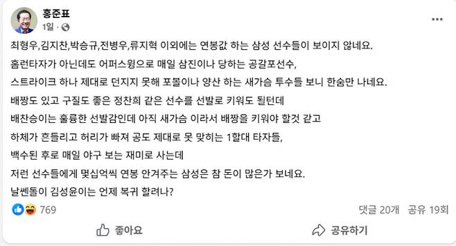 홍준표 전 대구시장이 삼성의 연패가 길어지던 시절 SNS에 "날쌘돌이 김성윤이는 언제 복귀하냐"고 썼을 때 팬들도 같은 마음이었다. 그리고 복귀 첫날 김성윤이 보여준 건, 그 기다림이 아깝지 않은 경기였다.