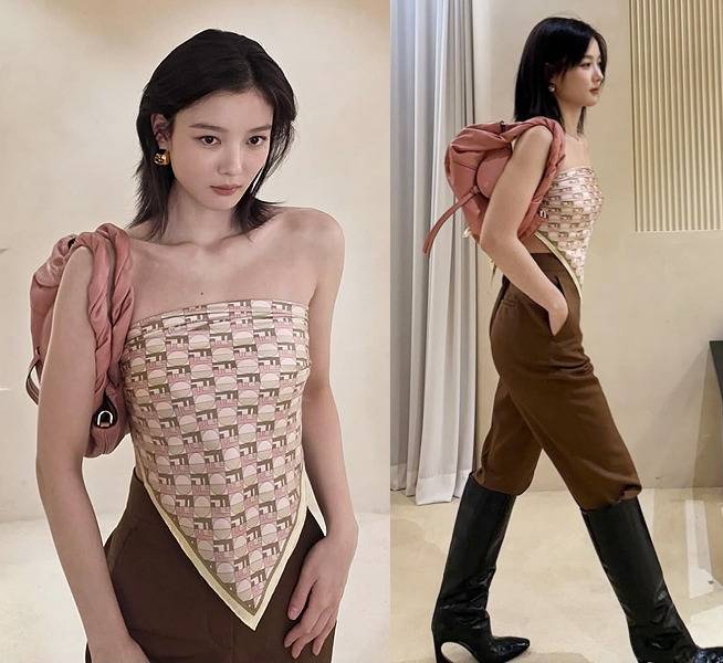 김유정은 파스텔톤이 감도는 핑크 베이스의 스카프탑으로 어깨와 등 라인을 과감하게 드러내며 시크하면서도 청순한 매력을 동시에 뽐냈습니다.