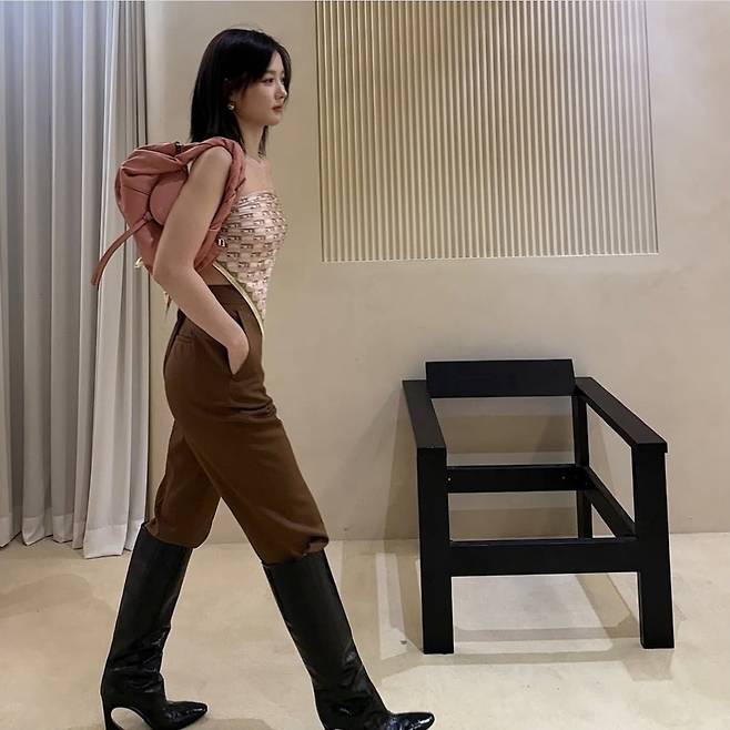 보디라인을 자연스럽게 감싸는 슬림한 스카프탑은 러블리한 패턴으로 포인트를 주면서도 상체라인을 깔끔하게 강조했고, 카멜톤의 슬림핏 팬츠와 롱부츠를 매치해 세련된 무드를 더했습니다.