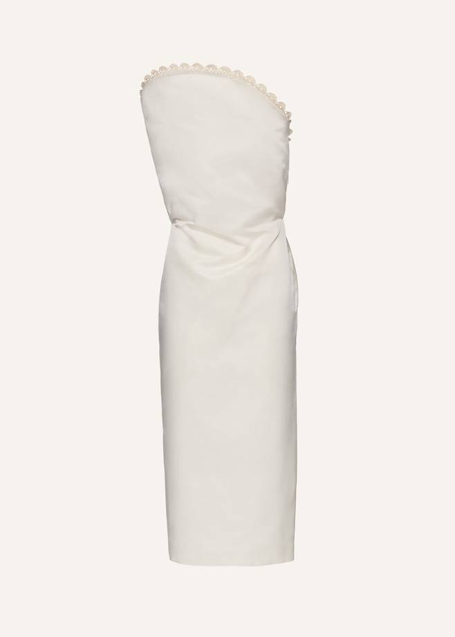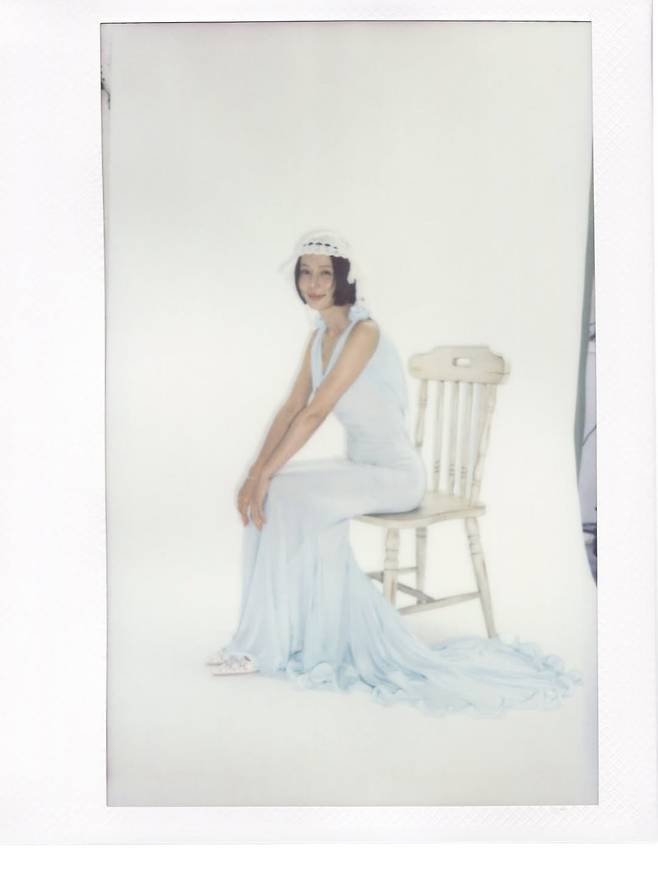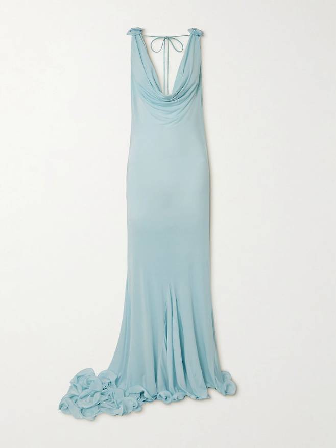 첫 번째 드레스는 하늘색 슬립 실루엣으로, 어깨에 장식된 셔링 디테일과