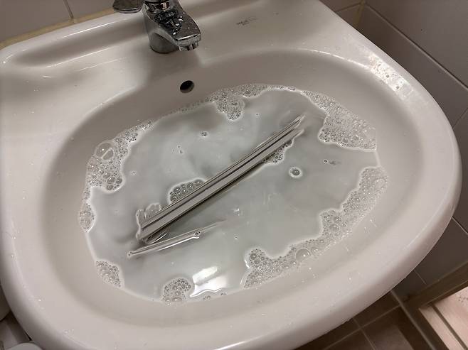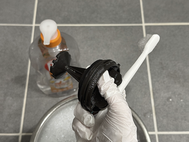 필자는 따뜻한 물에 중성 세제를 풀어 닦아주었는데 이전에 만든 청소 세제가 남았다면 그대로 사용해도 된다.