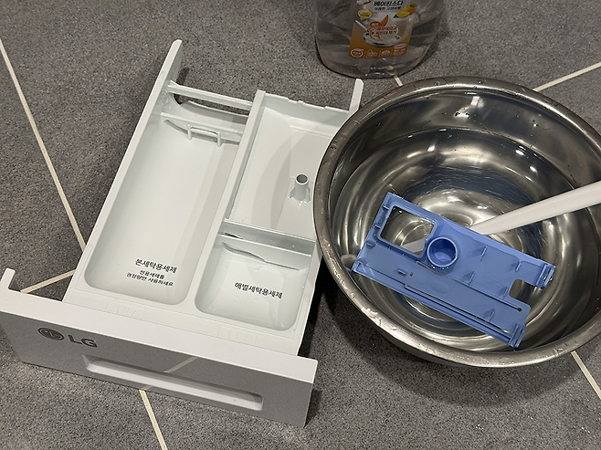 세제통을 끝까지 뺀 뒤 PUSH 버튼을 눌러 분리해 보자. 배수 필터와 마찬가지로 따뜻한 물에 불려 닦아주면 된다. 세제통을 빼는 방법은 제품마다 조금씩 다른데, 필자의 경우 PUSH 버튼이 아니라 그 위 부분을 누르고 세제통을 앞으로 당기니 빠졌다.