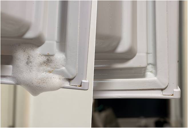 고무 패킹을 냉장고에서 분리한 다음 화장실 대야나 세면대에 차곡차곡 쌓자. 오염이 농축되어 있는 만큼 앞서 언급한 화학 물질로 뜸을 들여야 한다. 기획자의 경우 미온수에 과탄산소다와 주방 세제를 섞어 30분 정도 담가둔 뒤 미세 솔을 사용해 세척했다.