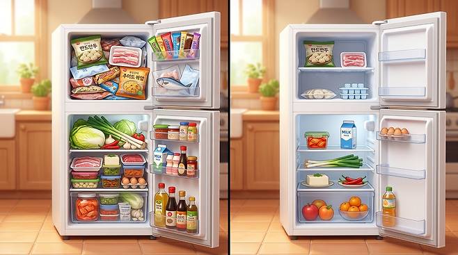 나중에 음식물이 썩어 냉장고가 더러워지는 것보다, 냉장고를 조금 비워둔 상태로 쓰면서 바로 먹어서 없애는 것이 1인 가구식 냉장고 관리 방법이다. PC 용량 관리처럼 냉장고 용량 관리만 잘해도 오염, 냄새, 냉각 효율, 전기 요금 모두 잡을 수 있다.