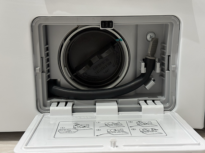통세척을 마쳤다면 거의 끝난 셈이다. 이제 세탁기 하단부에 있는 잔수 호스를 열어 세탁기 내부에 남은 물을 제거하자.