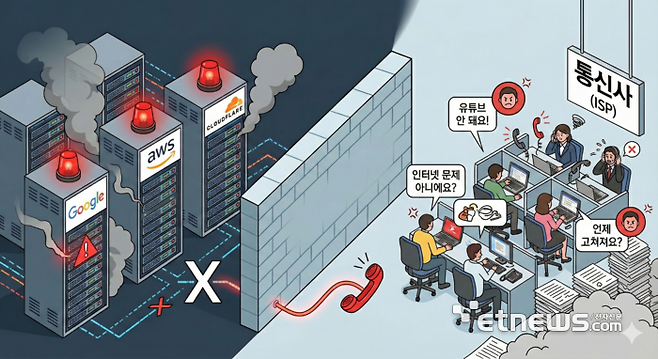 이는 글로벌 서비스 장애 때마다 반복되는 고질적 문제다. 지난해 11월 클라우드플레어의 봇 관리 오류 사태나 같은 해 10월 아마존웹서비스(AWS)의 DNS 오류로 글로벌 주요 서비스 2000여개가 마비됐을 때도 국내 통신망 장애로 오인한 소비자들의 민원은 모두 통신사로 향했다.