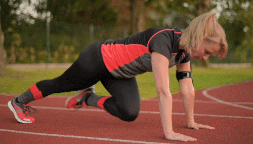 매트에 손바닥을 대고 엎드려 팔꿈치를 곧게 편 플랭크 자세를 유지합니다. 이 상태에서 왼쪽 다리를 가슴 쪽으로 당겼다가 되돌리고, 이어서 오른쪽 다리도 같은 방식으로 반복합니다.