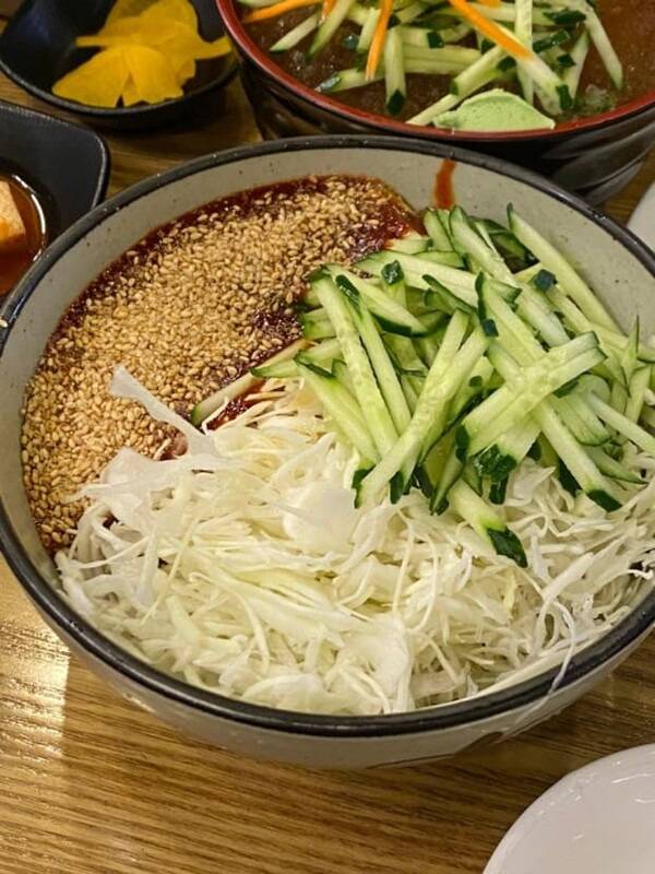 면은 메밀 함량이 높아 구수한 맛이 특징입니다. 여기에 오이, 김, 계란 지단 등 기본 토핑과 함께 직접 만든 겨자소스를 곁들이면 완벽한 한 그릇이 완성됩니다.