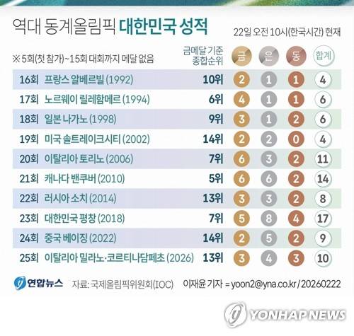한국은 22일 오전 10시(한국시간) 현재 금메달 3개, 은메달 4개, 동메달 3개를 획득해 종합 13위에 자리했다. 한국은 2022 베이징 대회(금메달 2개, 은메달 5개, 동메달 2개·14위)의 성적을 뛰어넘었으나 종합 순위 '톱10' 진입은 이루지 못했다.