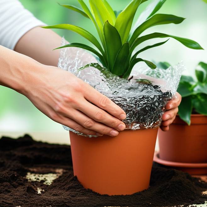 • 에어캡: 화분 전체를 에어캡으로 꼼꼼하게 감싸 파손을 방지합니다. 특히 흙이 쏟아지지 않도록 윗부분을 잘 막아줍니다.