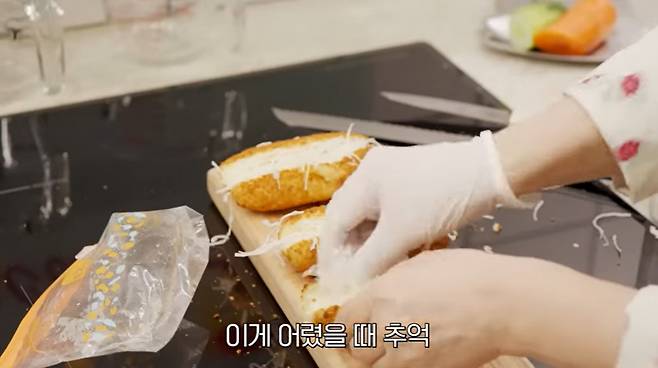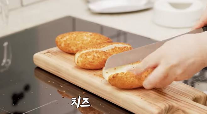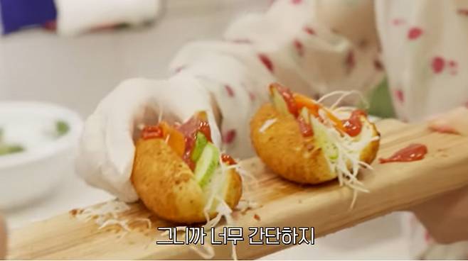 1. 시중에 판매하는 냉동 핫도그를 오븐이나 에어프라이어, 혹은 전자렌지에 데워 준비한다. 최화정은 모짜렐라 치즈가 들어간 핫도그를 준비했다.