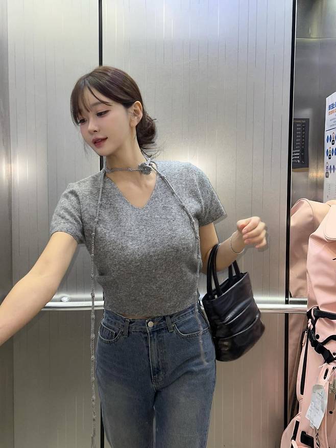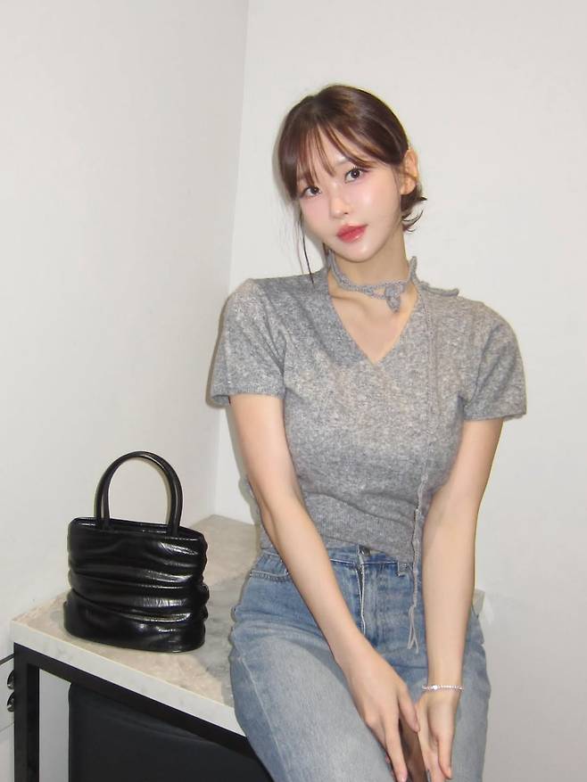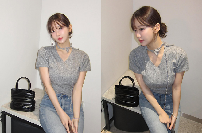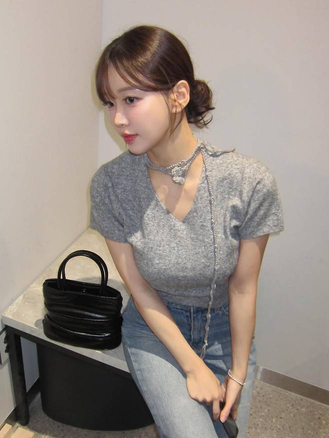 사진 속 김윤희는 몸에 붙는 회색 니트 상의에 연청 데님 팬츠를 매치하여 편안하면서도 여성스러운 데이트룩을 선보였습니다.