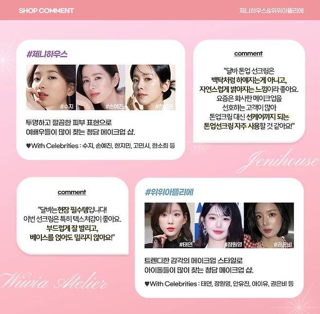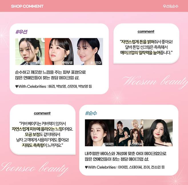 태연, 장원영, 안유진, 아이유, 권은비 등 아이돌들이 실제로 메이크업을 받는 곳이야.