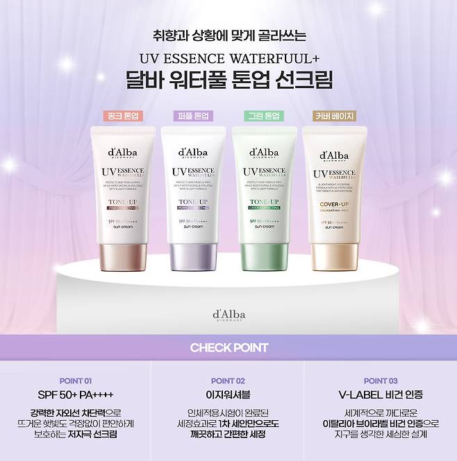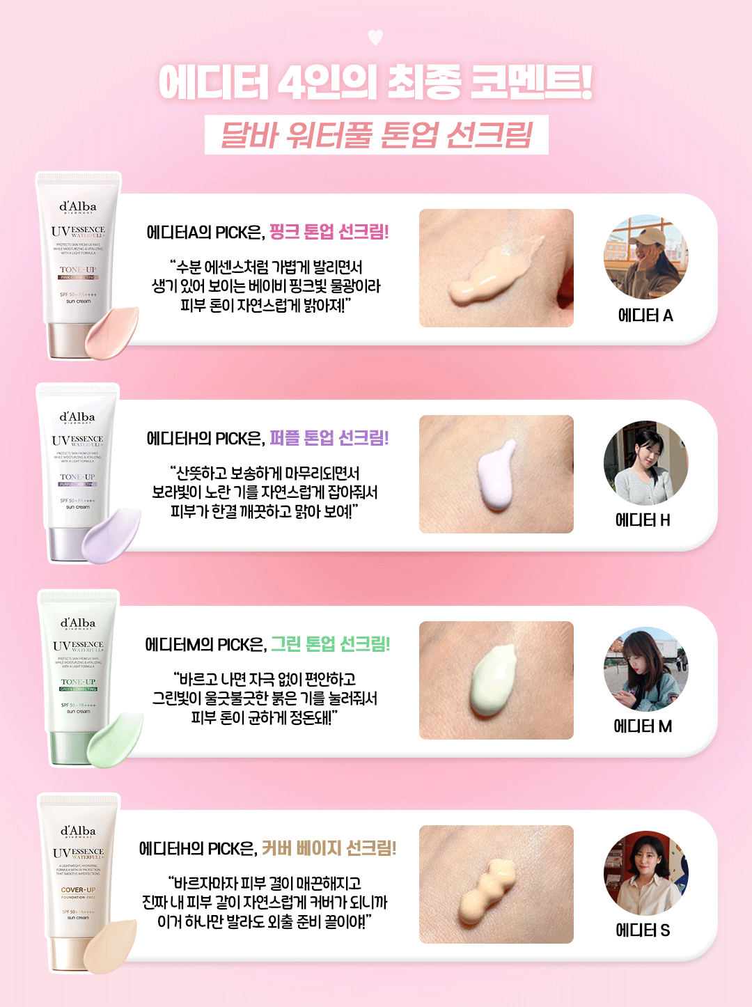 달바 워터풀 톤업 선크림은 전부 SPF50+ PA++++의 높은 자외선 차단 지수로, 선기능 + 스킨케어링 + 피부결개선까지 3 in 1 올인원 케어가 가능해. 취향이랑 피부 상태에 맞게 고를 수 있게 4가지 컬러로 나와 있어.