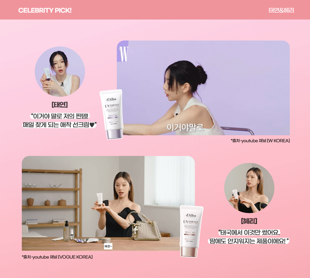대표적으로 태연이랑 혜리가 달바 톤업 선크림을 직접 사용하면서 극찬했는데,