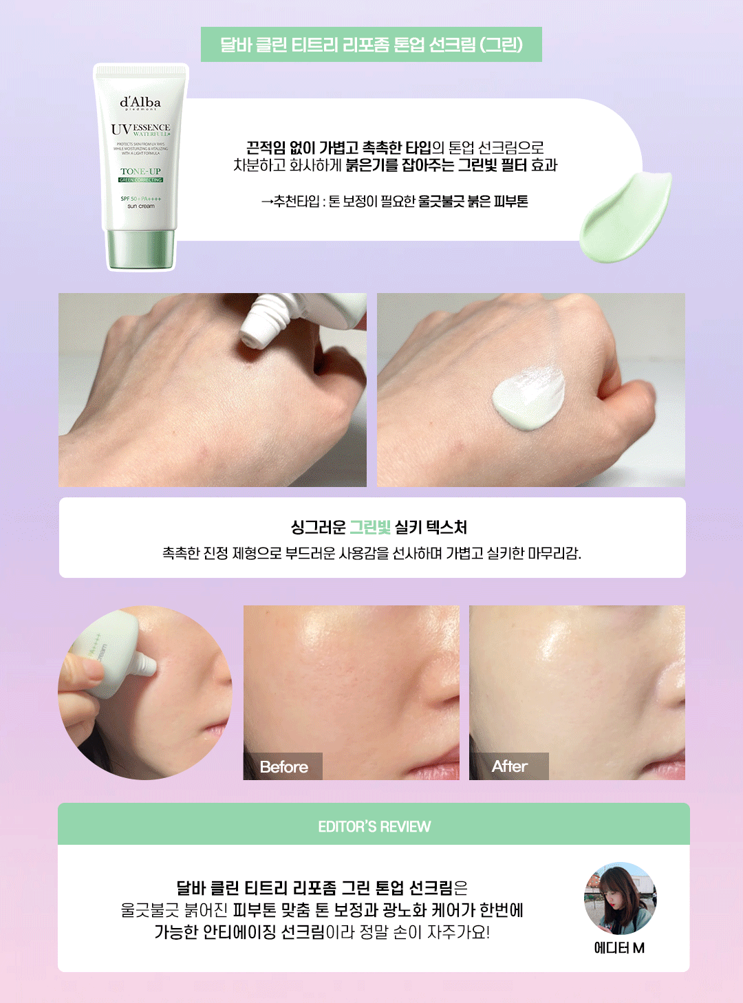 바르자마자 에러리하게 퍼지면서 피부에 가볍게 밀착돼서 노란 기를 정리해 주는 퍼플 톤업 선크림이야.