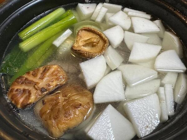 1. 다시마, 무, 파, 표고버섯, 마늘을 물에 담가 3시간 이상 우린 뒤 약불에 20분간 끓입니다.