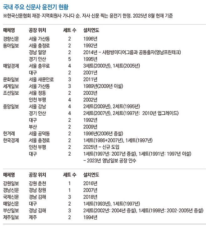 2025년 윤전기 현황을 보면 서울 소재 대형 신문사는 과거와 비슷하거나 가동 윤전기 수를 늘렸다. 동아일보는 2019년 당시 서울 충정로(2세트)와 경남 밀양(2세트), 경기 안산(4세트) 등에 총 8세트 윤전기를 보유했으나 현재는 9세트를 운영 중이다. 서울 오금동 공장 문을 닫으며 남아 있던 기계를 안산 공장(5세트)으로 이설했다. 경남 밀양 공장은 2014년 호남 지역에 기반한 사랑방미디어그룹과 공동 출자로 설립(영남프린테크)해 영남권 물량을 찍고 있다.