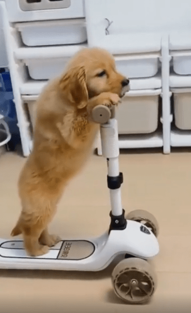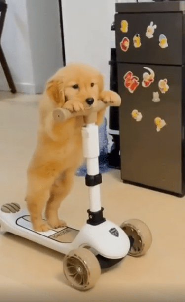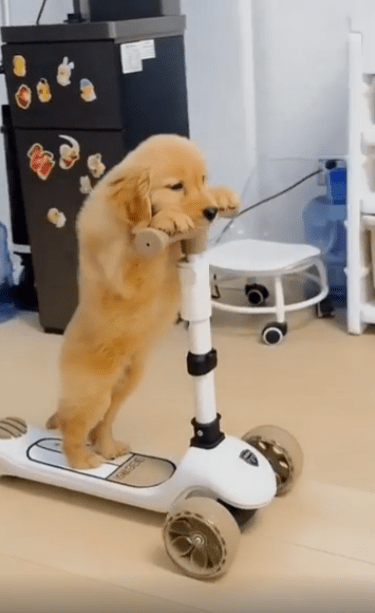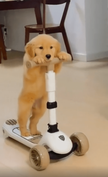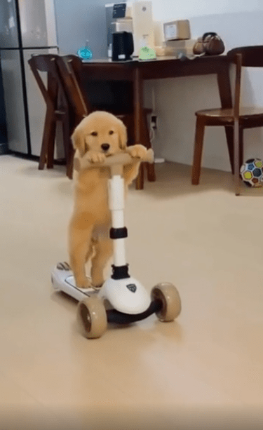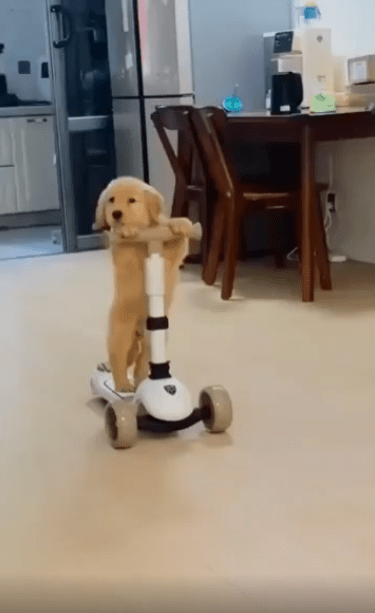 유아용 킥보드 위에 강아지 한 마리가 올려져 있습니다. 그런데 단순히 앉아 있는 게 아니었습니다. 이 강아지, 두 발로 떡 하니 서서 직접 킥보드를 타고 있었죠. 마치 누가 가르쳐준 듯, 아니면 원래 그렇게 태어난 듯—자세는 안정감 있고 시선은 곧게 앞을 향하고 있었습니다.