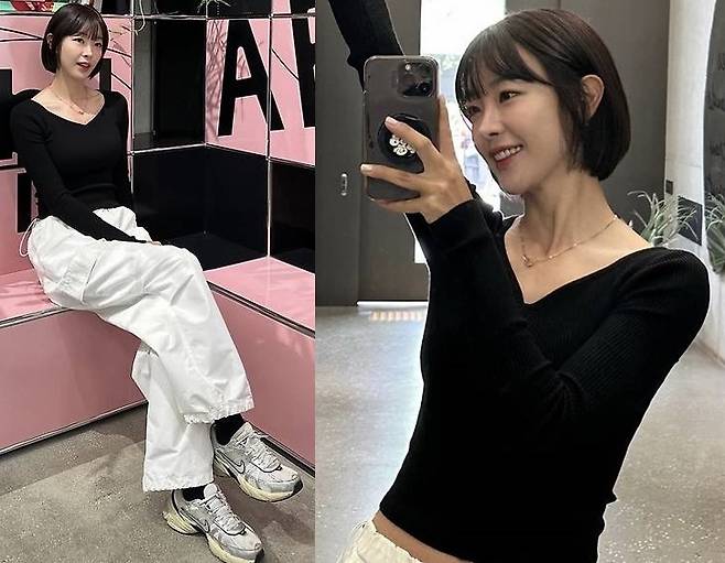 고원희는 블랙과 화이트의 대비가 돋보이는 감각적인 스타일링으로 볼륨감 있는 넥라인이 깊이 파인 블랙 톱에 화이트 카고 팬츠를 매치해 세련되면서도 캐주얼한 무드를 연출했습니다.