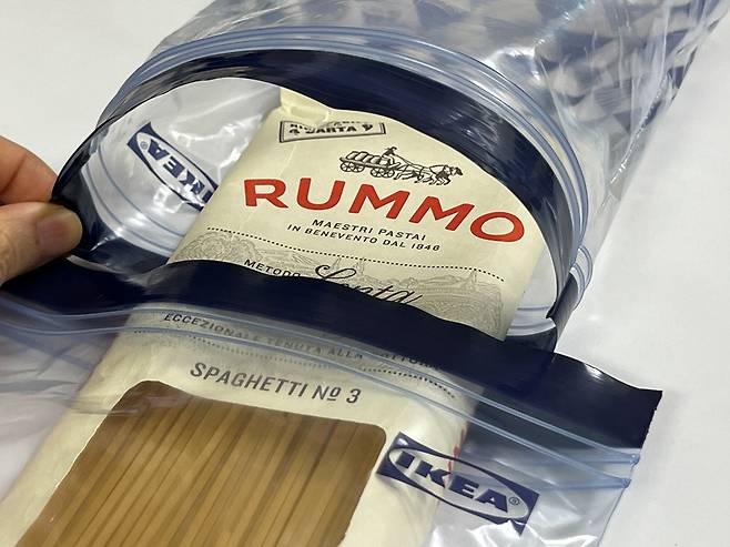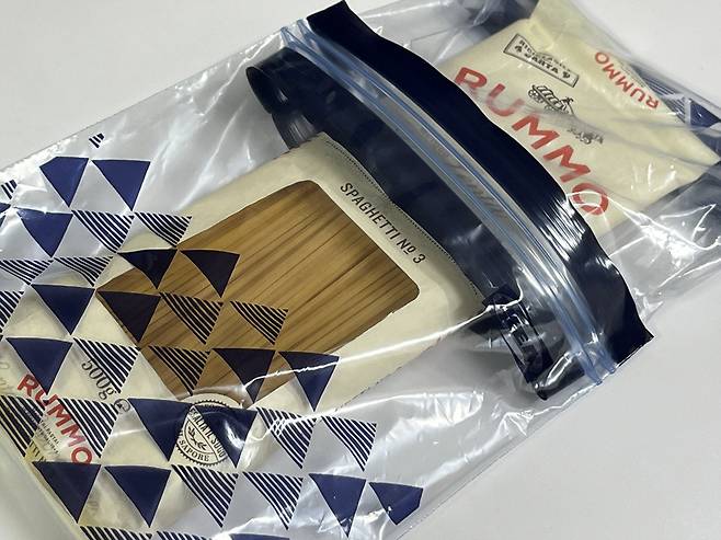 그러면 기다린 스파게티면도 모두 커버할 수 있는데요. 지퍼락 위치만 잘 맞춰서 밀봉해 보세요. 이렇게 하면 국수나 스파게티면도 얼마든 보관할 수 있습니다.