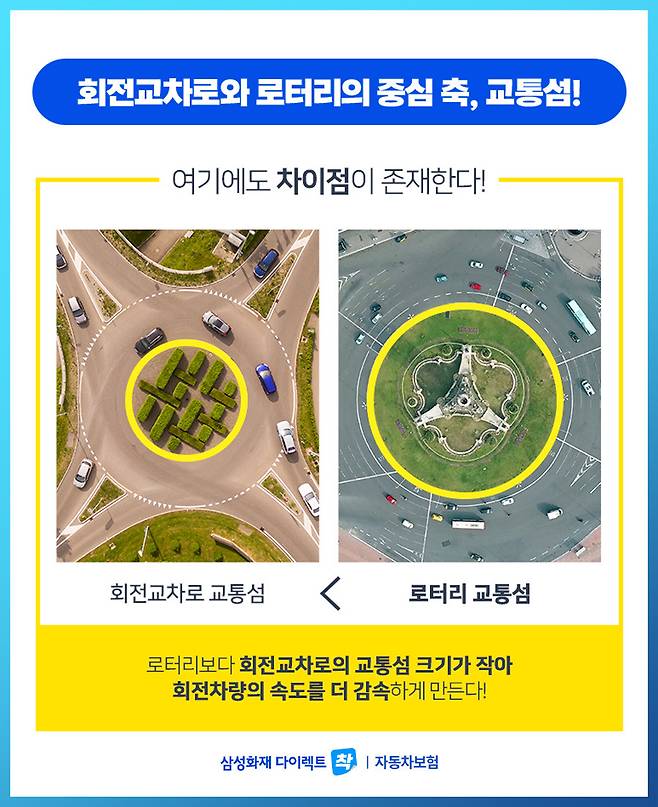 로터리보다 회전교차로의 교통섬이 크기가 작아 달리는 자동차의 속도를 감속하도록 만들어 주는 역할을 합니다.