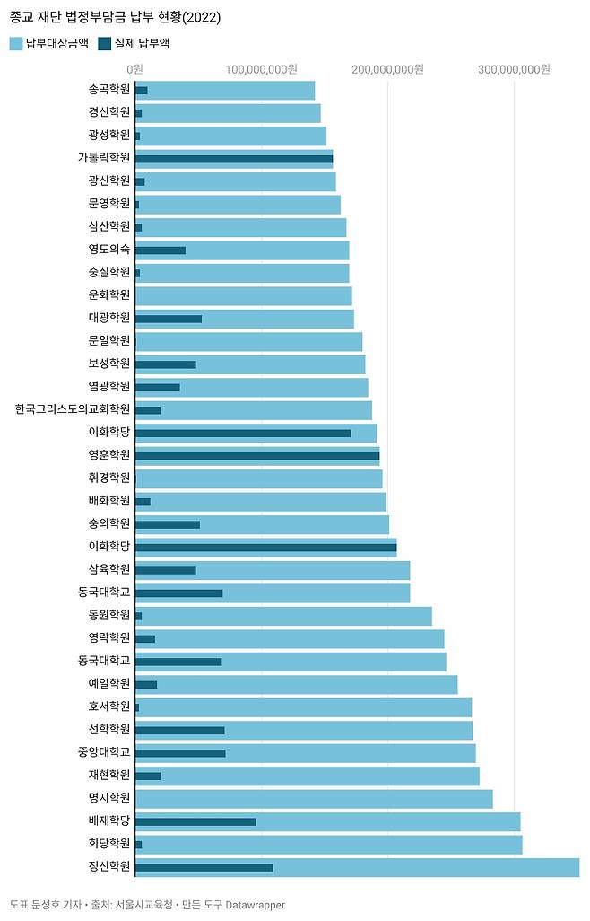 | ▲ 종교재단별 법정부담금 납부 현황(자료 : 서울시교육청 2022년 '관내 사립학교 법정부담금 법인부담률 현황' |