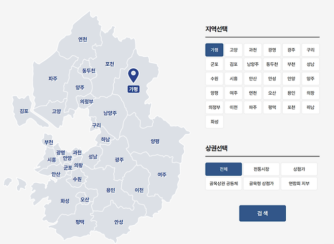 두 번째는 경기도시장상권진흥원 누리집을 이용하는 방법입니다. 홈페이지에서 통큰 세일 메뉴를 선택한 뒤 지역과 상권을 선택하면 참여 매장을 확인할 수 있습니다.