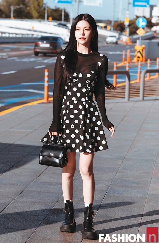 그룹 있지(ITZY)의 예지가 시스루 톱에 땡땡이 원피스 출국룩으로 꽃미모를 발산했다.